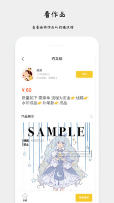 6、找画师,每天都有新入驻画师,随意挑选,看作品,查看画师作品和约稿流程。