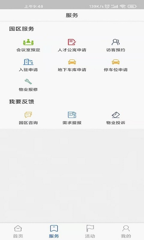 里面设有迁入迁出申请,保洁服务,礼品包装,行业资讯,专题研究,和大数据统计等等,