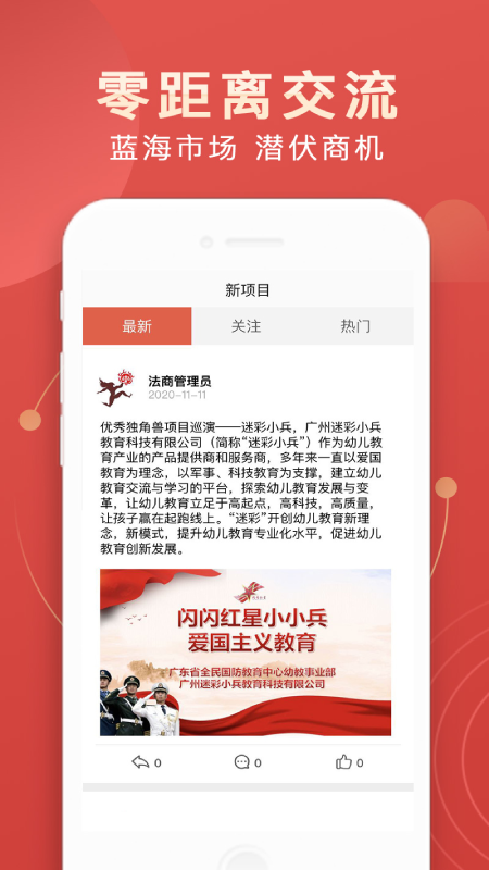 通过高级的社交商务模式,用户自己可以在软件中和其他的专业投资者进行互动和交流,及时把握各种需求内容,拓宽自己交际圈的同时也可以更好的来提供专业项目资源。